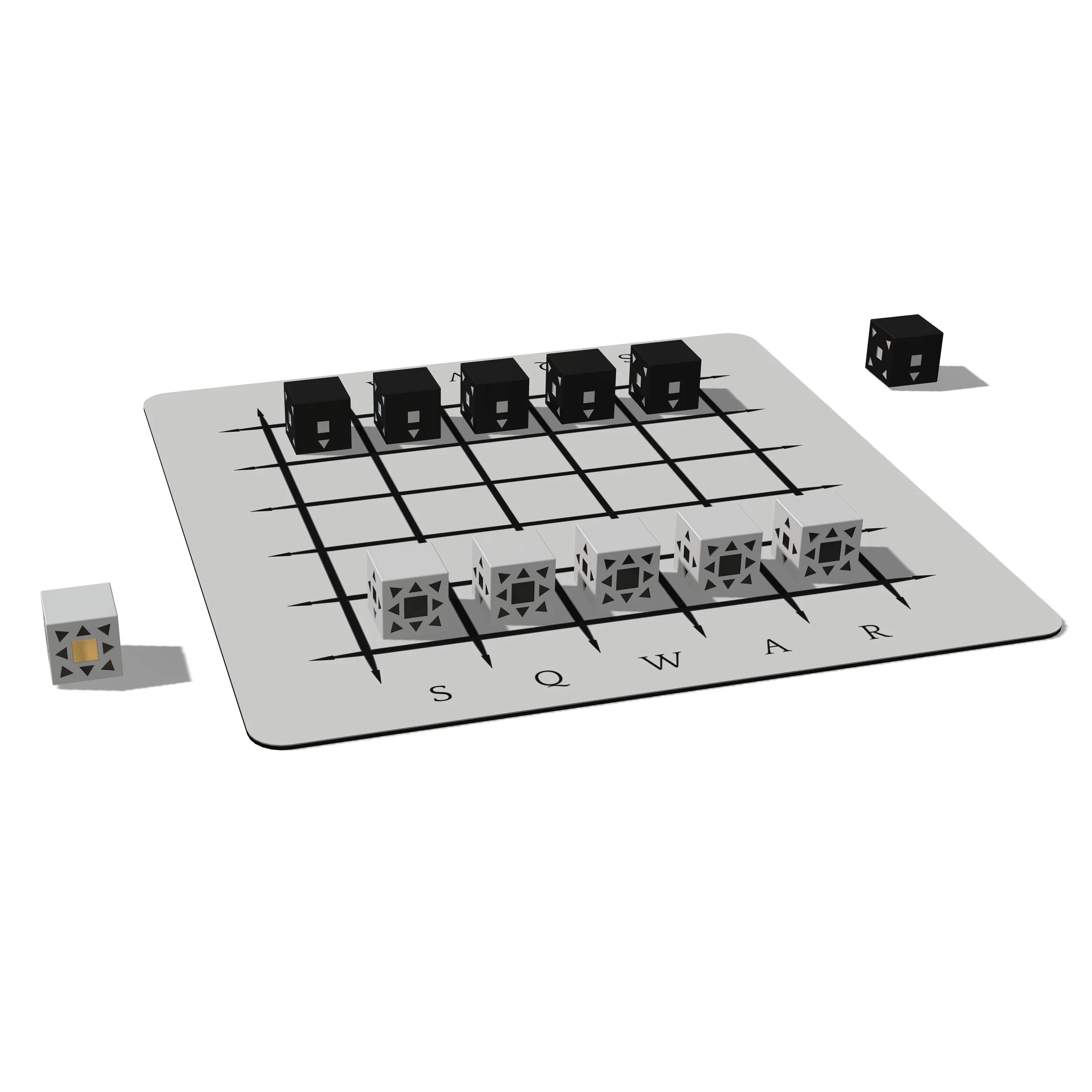 SQWAR™ is a two player strategy tabletop board game. The objective is to eliminate all of your opponents army or the opponents general from the game or have your fully ranked general reach the opponent's side.